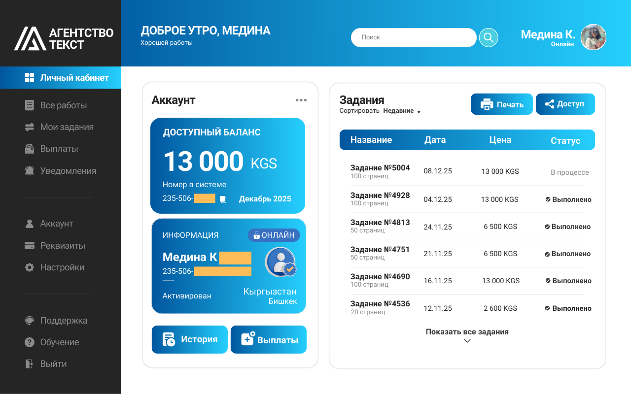 У каждого будет личный кабинет. Вы сможете получать задания, отправлять работу, общаться с другими работниками. Контролировать свои выплаты и сроки.